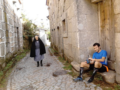 por uma calçada romana bastante técnica e escorregadia (estava tudo molhado)